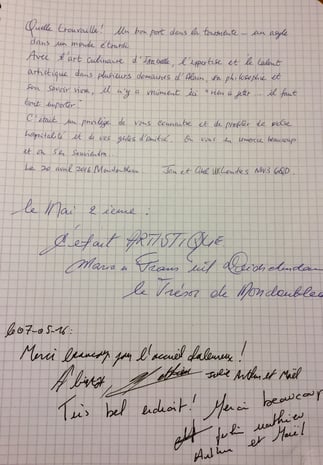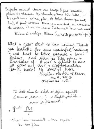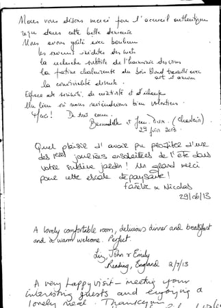 Message: Thank you, dear Isabelle, for a delightful and very restful stay at your beautiful home. I especially enjoyed and appreciate the achievement of bringing the new into the very old, blending the present with the past. Each space is a delicious feast for the eyes. And breakfast! all your wonderful confitures were a treat to the palate. You could not have made it more pleasant for us.